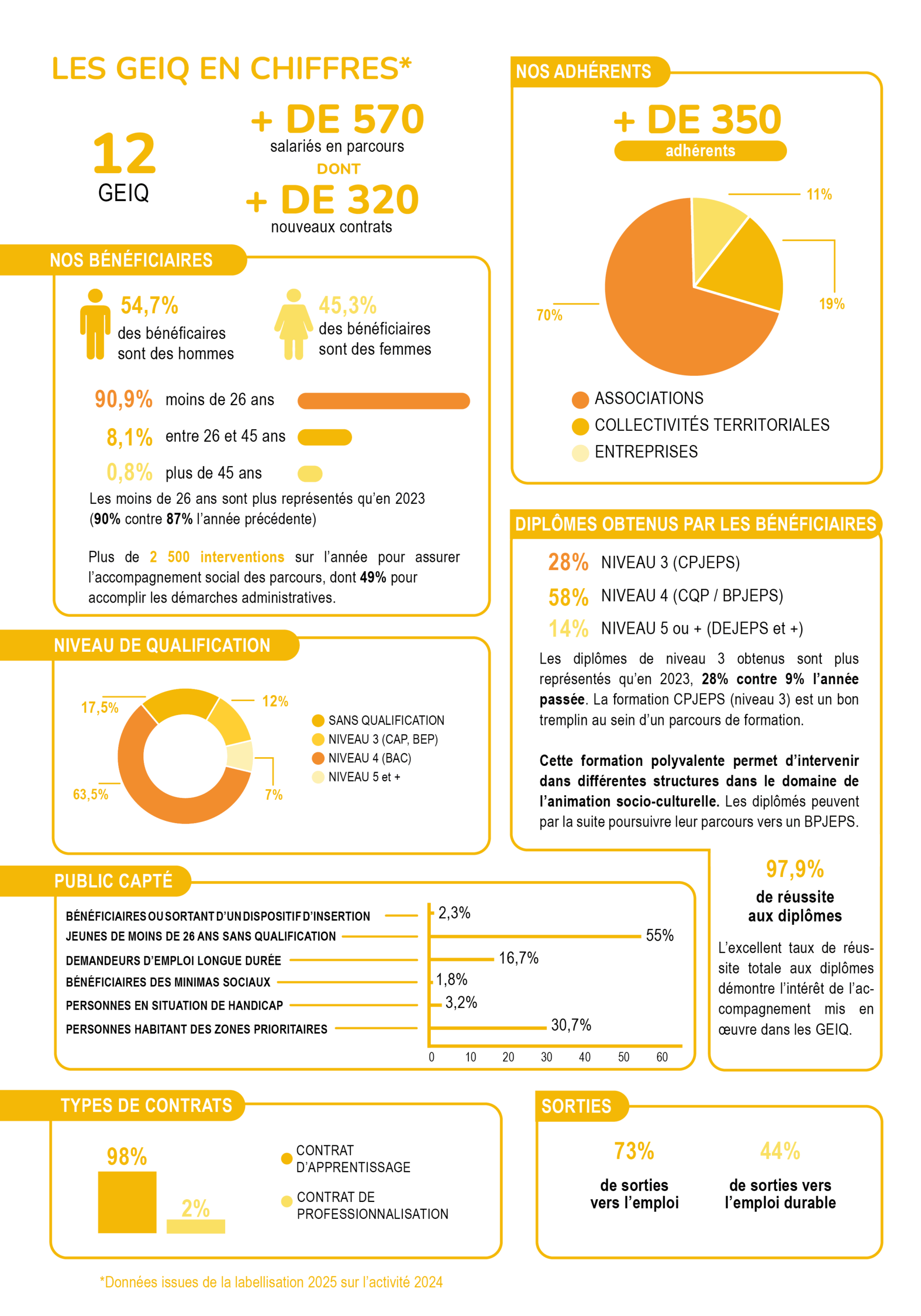 Un GEIQ (Groupement d’Employeurs pour l’Insertion et la Qualification) est une association pilotée et gérée par ses entreprises et/ou ses associations adhérentes mobilisées pour favoriser l’insertion des personnes éloignées du marché du travail grâce à l’alternance.