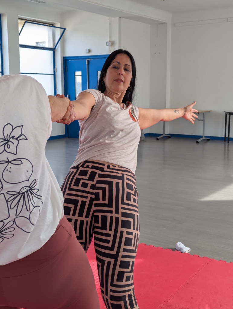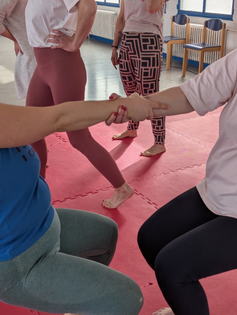 Nous posons un cadre de sécurité, nous proposons d’abord un échauffement individuel puis des jeux collectifs en introduisant de manière progressive le contact. Nous terminons la séance par des figures d’acroyoga et une relaxation.